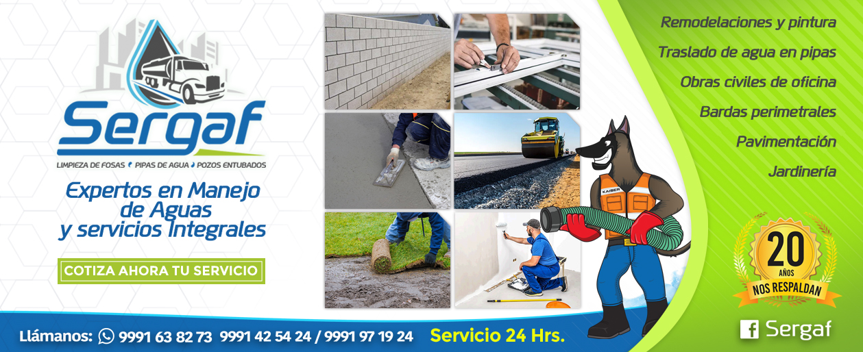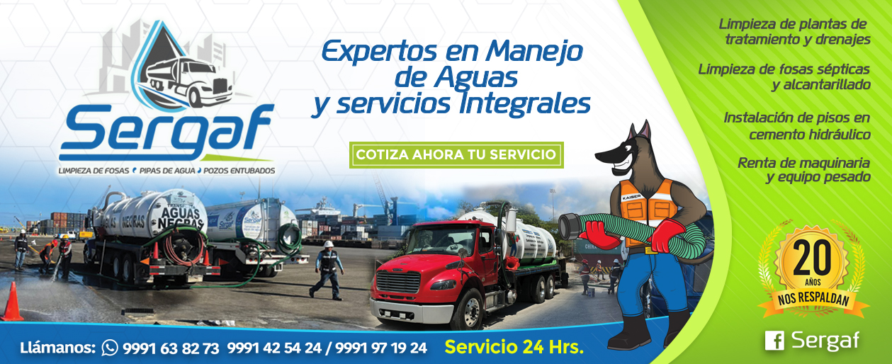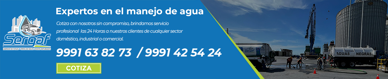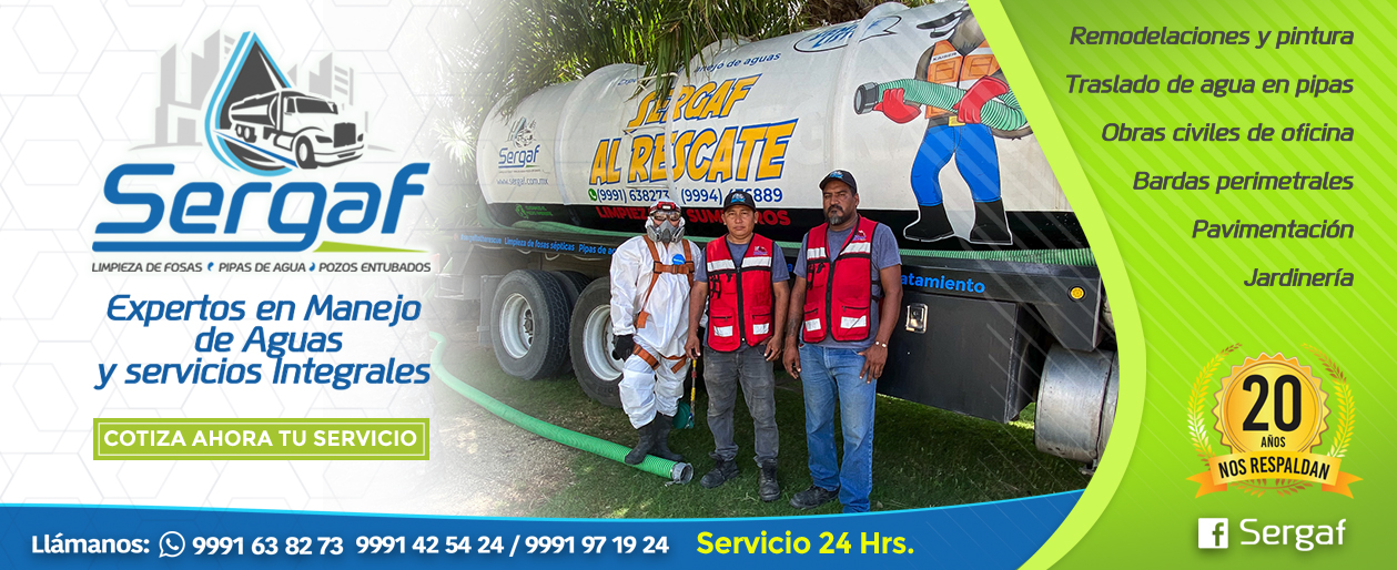 SERGAF es una empresa que cuenta con más de 20 años de experiencia en Mérida y la costa yucateca, ofreciendo a sus clientes el mejor servicio de transporte de pipas de agua potable, perforación de pozos entubados, limpieza de fosas sépticas, cañerías, cárcamos, biodigestores brindamos mantenimiento y limpieza a plantas de tratamiento de aguas residuales y plantas purificadoras.